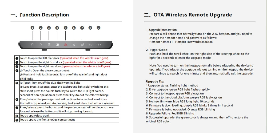 【8개 단축키】 : 글러브 박스 열기, 도어 열기, 뒷좌석 좌우 도어 아동 잠금, 이중 플래시 켜기, 라이트 색상 켜기, 시트 조절 켜기, 앞 트렁크 열기, 트렁크 열기 등 최대 8개 단축키를 간편하게 완료할 수 있습니다.